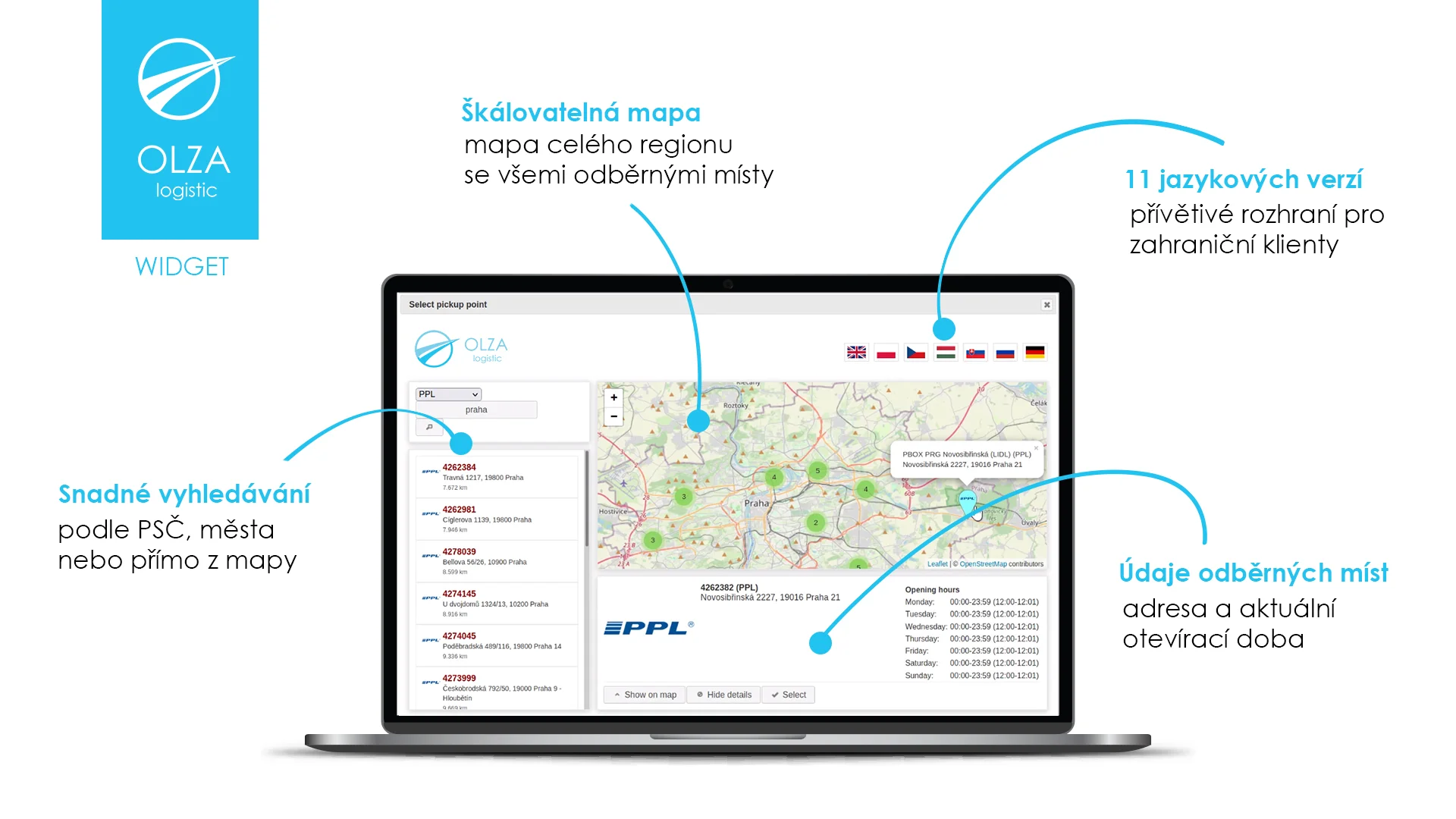Přístup k databázi výdejních míst získáte zdarma v podobě integrace API nebo jako widget připravený k implementaci. V případě rozhraní API můžete prezentaci svých výdejních míst libovolně konfigurovat, přizpůsobit a obrandovat. Pokud si vyberete widget, nemusíte dělat již nic dalšího. Jednoduše jej vložte na svůj e-shop.